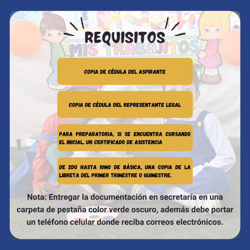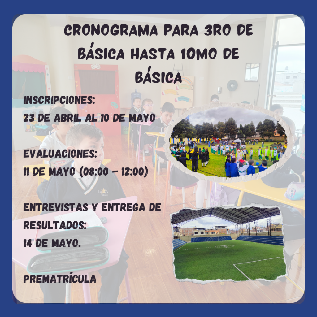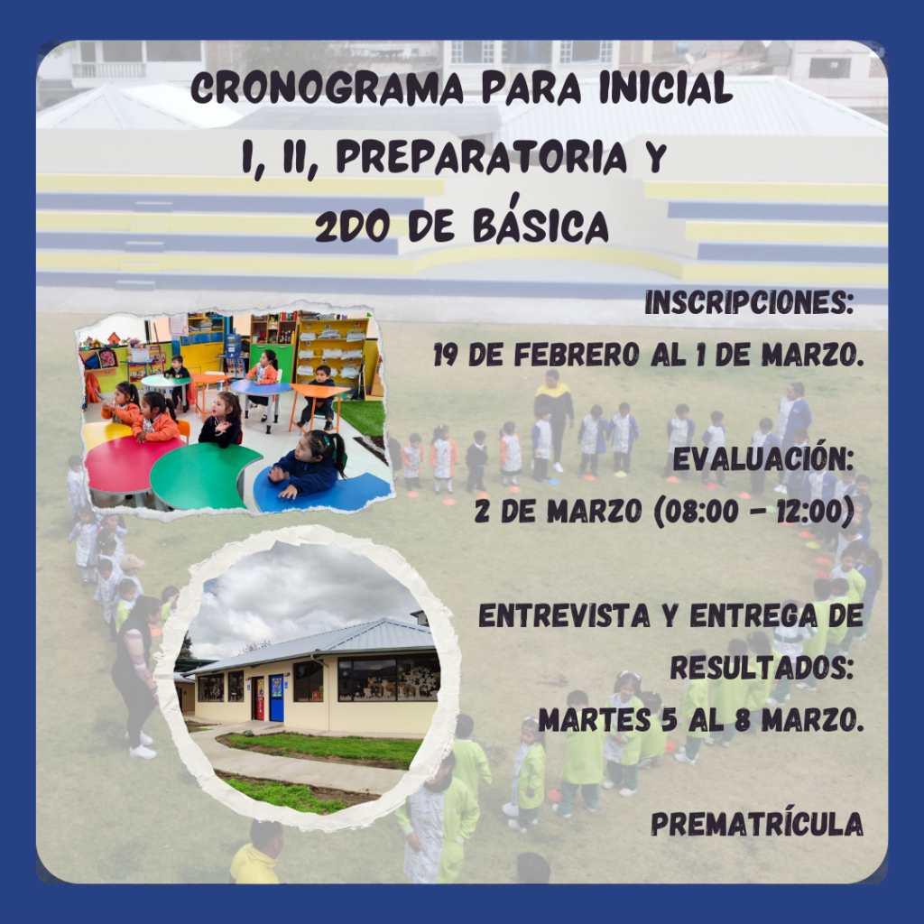 Para agilitar el proceso y evitar la aglomeración de personas se solicita muy comedidamente seguir el siguiente cronograma:1. 13 de agosto: Inicial 2, preparatoria y 2do de básica.2. 14 de agosto: 3ro, 4to y 5to de Educación General Básica.3. 15 de agosto: 6to y 7mo de Educación General Básica.4. 18 de agosto: 8vo y 9no…